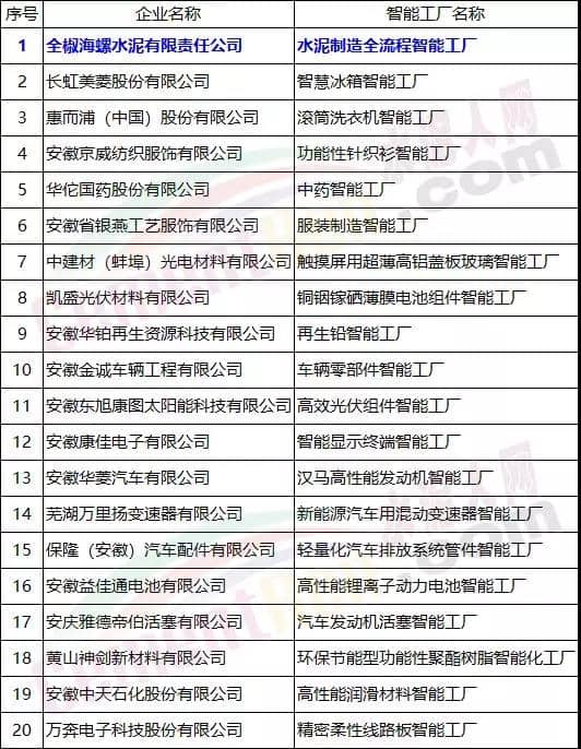 2019年安徽省智能工廠名單