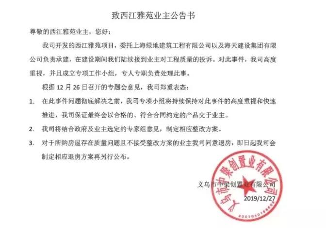 在公告書中,中梁創(chuàng)置業(yè)稱,公司開發(fā)的西江雅苑項目,委托上海綠地建筑工程有限公司以及海天建設集團有限公司負責承建,在建設期間陸續(xù)接到業(yè)主對工程質(zhì)量的投訴。對此事件,公司高度重視,并且成立專項工作小組,專人專職負責處理此事。