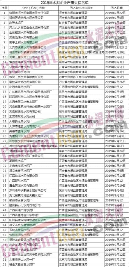 近些年來,失信行為并不少見,各行各業(yè)都存在嚴(yán)重失信行為,水泥行業(yè)也有不少企業(yè)存在嚴(yán)重失信行為,大多數(shù)都是一些小型企業(yè)。日前,水泥人網(wǎng)從國家企業(yè)信用信息公示系統(tǒng)獲悉,據(jù)不完全統(tǒng)計,2019年高達(dá)52家水泥企業(yè)被列入了嚴(yán)重違法失信企業(yè)名單(即“黑名單”),其中名單如下: