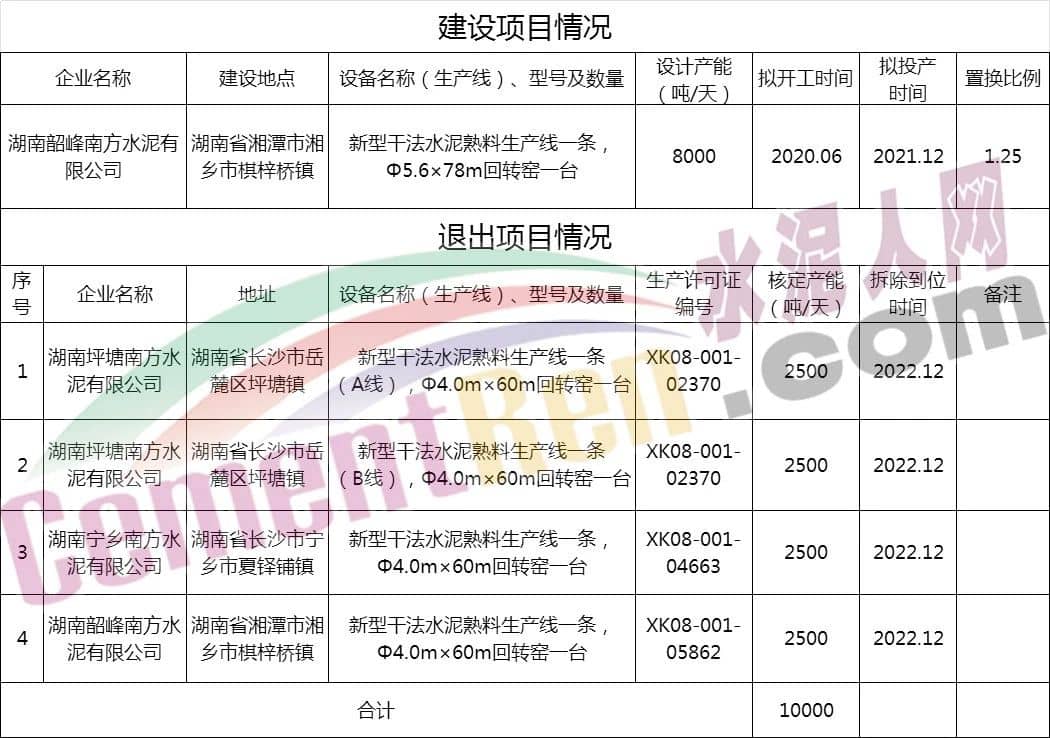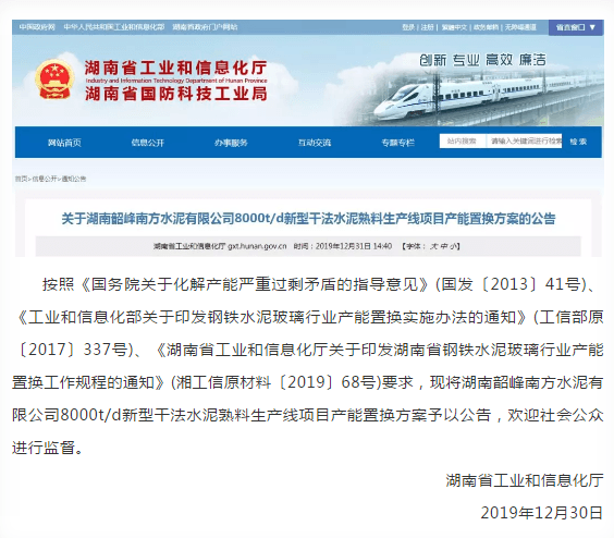 昨日(12月31日),湖南省工業(yè)和信息化廳發(fā)布了《關(guān)于湖南韶峰南方水泥有限公司8000t/d新型干法水泥熟料生產(chǎn)線項(xiàng)目產(chǎn)能置換方案的公告》,原文如下: 產(chǎn)能置換方案如下: 上述方案顯示,湖南韶峰南方水泥有限公司將在湖南省湘潭市湘鄉(xiāng)市棋梓橋鎮(zhèn)擬建一條日產(chǎn)8000噸熟料生產(chǎn)線(Φ5.6×78m回轉(zhuǎn)窯),擬2020年6月開(kāi)工,2021年12月投產(chǎn)。
