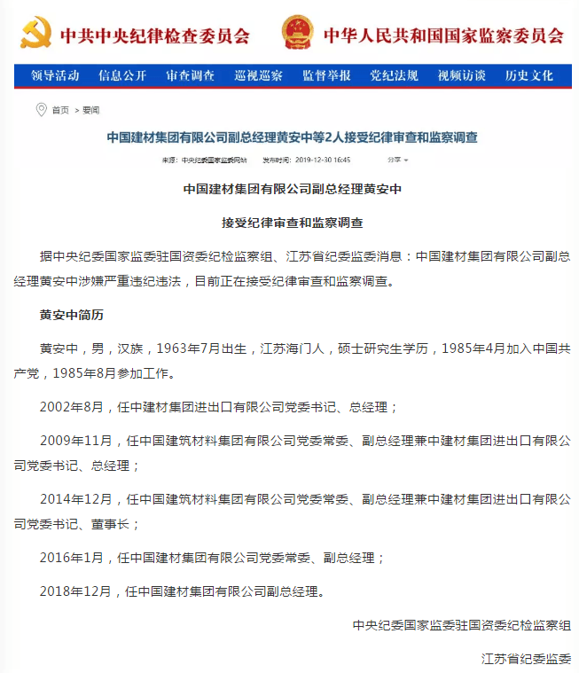 據(jù)中央紀(jì)委國家監(jiān)委駐國資委紀(jì)檢監(jiān)察組、江蘇省紀(jì)委監(jiān)委消息:中國建材集團有限公司副總經(jīng)理黃安中等2人接受紀(jì)律審查和監(jiān)察調(diào)查。