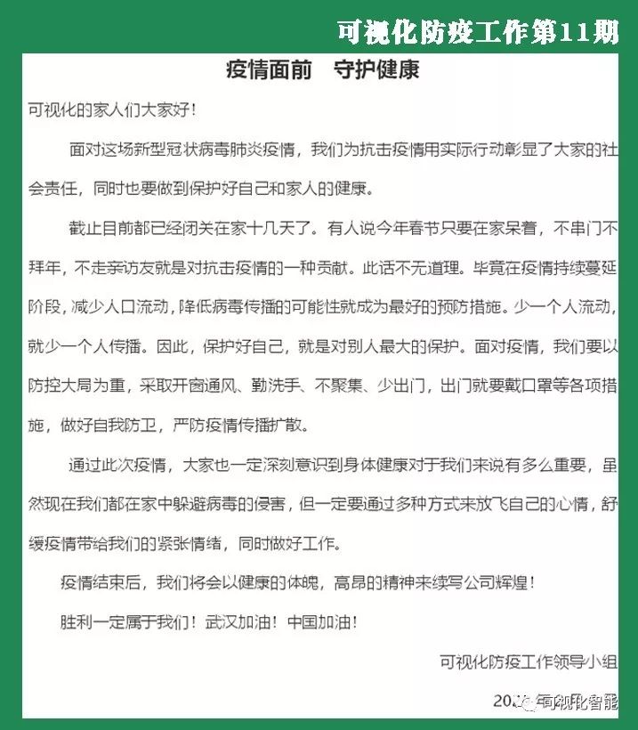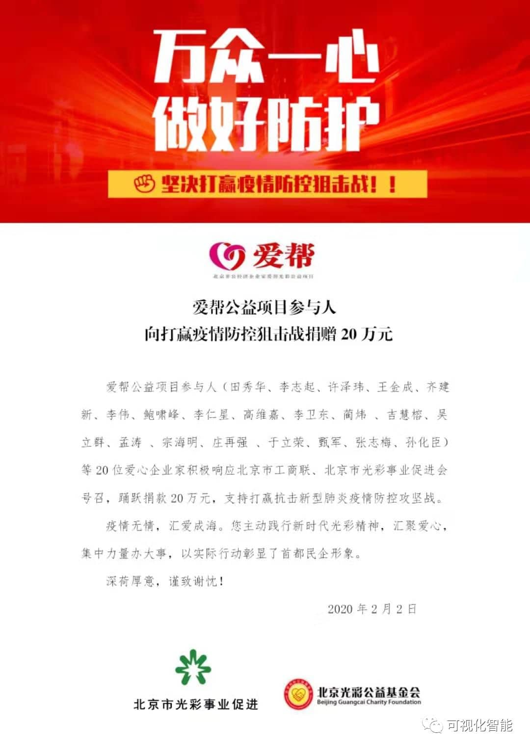 北京可視化智能科技公司始終踐行企業(yè)社會(huì)責(zé)任,將與各方風(fēng)雨同舟、共克時(shí)艱。面對(duì)疫情,我們毫不退縮,我們堅(jiān)信在黨中央的正確領(lǐng)導(dǎo)及各方的共同努力下,定能打贏這場(chǎng)沒有硝煙的疫情防控戰(zhàn)。待到冬去春來,我們一起看花開!