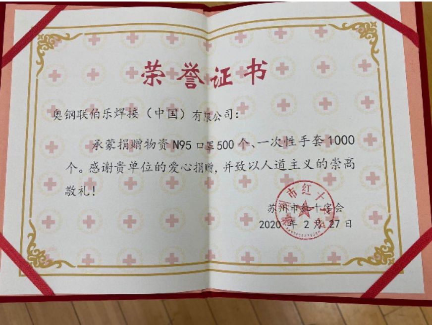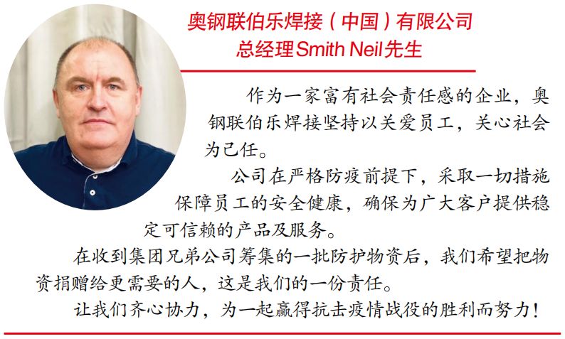奧鋼聯(lián)伯樂焊接(中國)有限公司總經(jīng)理 Neil Smith先生說:作為一家富有社會責(zé)任感的企業(yè),奧鋼聯(lián)伯樂焊接堅(jiān)持以關(guān)愛員工,關(guān)心社會為己任。 公司在嚴(yán)格防疫前提下,采取一切措施保障員工的安全健康,確保為廣大客戶提供穩(wěn)定可信賴的產(chǎn)品及服務(wù)。在收到集團(tuán)兄弟公司籌集的一批防護(hù)物資后,我們希望把物資捐贈給更需要的人,這是我們的一份責(zé)任。