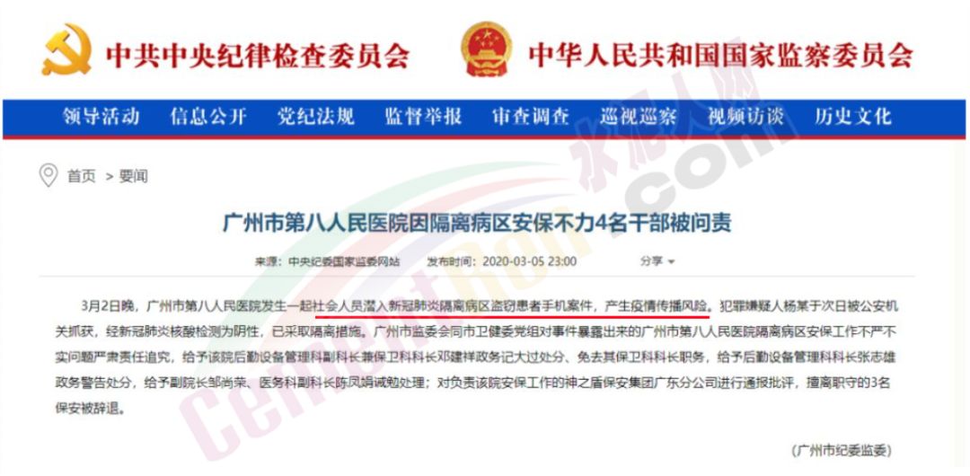 廣州市監(jiān)委會(huì)同市衛(wèi)健委黨組對(duì)事件暴露出來的廣州市第八人民醫(yī)院隔離病區(qū)安保工作不嚴(yán)不實(shí)問題嚴(yán)肅責(zé)任追究,給予該院后勤設(shè)備管理科副科長兼保衛(wèi)科科長鄧建祥政務(wù)記大過處分、免去其保衛(wèi)科科長職務(wù),給予后勤設(shè)備管理科科長張志雄政務(wù)警告處分,給予副院長鄒尚榮、醫(yī)務(wù)科副科長陳鳳娟誡勉處理;