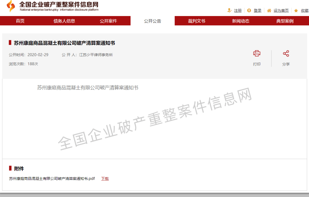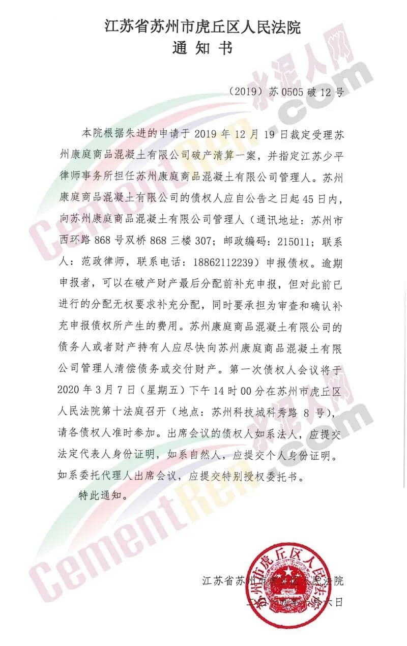 通知書稱:根據(jù)朱進(jìn)的申請(qǐng)于2019年12月19日裁定受理蘇州康庭商品混凝土有限公司破產(chǎn)清算一案 ,并指定律所擔(dān)任其管理人。蘇州康庭商品混凝土有限公司的債權(quán)人自公告之日起45日內(nèi)可申請(qǐng)債權(quán)。