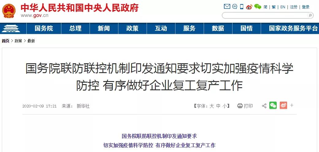 2月8日,國務(wù)院應(yīng)對(duì)新型冠狀病毒感染肺炎(以下簡稱“新冠肺炎”)疫情聯(lián)防聯(lián)控機(jī)制印發(fā)《關(guān)于切實(shí)加強(qiáng)疫情科學(xué)防控 有序做好企業(yè)復(fù)工復(fù)產(chǎn)工作的通知》(以下簡稱《通知》)。