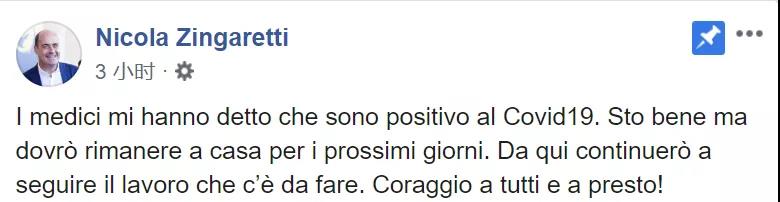 據(jù)環(huán)球網(wǎng)援引路透社報道,意大利聯(lián)合執(zhí)政的民主黨領(lǐng)導(dǎo)人津加雷蒂周六(7日)表示,他被檢測出新型冠狀病毒呈陽性。