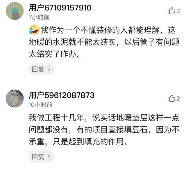 另外的網(wǎng)友卻認(rèn)為張先生明顯就是訛詐,稱商家在安裝地暖上沒(méi)有一點(diǎn)毛病,用砂漿回填是絕對(duì)可以的,這樣有助于后期維修, 如果水泥完全凝固的話,對(duì)地暖散熱就會(huì)存在一定的影響。