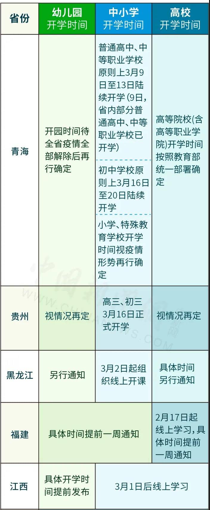 例如,2月27日,貴州省委、省政府研究確定:該省高三年級和初三年級學(xué)生3月16日正式開學(xué),其他學(xué)段、高中初中其他年級開學(xué)時間將視下一階段疫情防控情況,經(jīng)科學(xué)評估后再行確定并向社會公布。