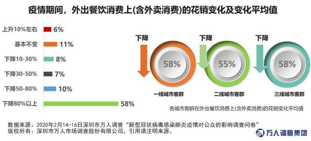 數(shù)據(jù)顯示,近六成市民表示疫情期間外出餐飲支出下降超過(guò)80%。整體來(lái)看,一二三線城市的市民在餐飲(含外賣)花銷的降幅較為一致,平均下降比例均在55%-58%之間。