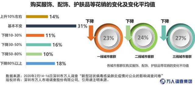 此外,服裝和化妝品方面,很多品牌關(guān)閉了中國(guó)內(nèi)地部分門店以減少成本,并逐步將重心轉(zhuǎn)至線上。數(shù)據(jù)顯示,由于服飾和化妝品仍可從線上渠道購(gòu)買,31%的市民表示支出整體維持不變,但是由于快遞停運(yùn)、物流周期過(guò)長(zhǎng)等原因,整體購(gòu)物體驗(yàn)并不好,55%的市民表示支出有所下降,其中下降超過(guò)80%的占比達(dá)到18%。