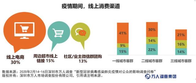 通過(guò)調(diào)查發(fā)現(xiàn),線上電商在不同年齡層消費(fèi)者中的影響已經(jīng)顯現(xiàn),全民“下單”熱。線上電商(叮咚買菜、每日優(yōu)鮮、盒馬、美團(tuán)等)的消費(fèi)熱度:一線遠(yuǎn)遠(yuǎn)好于二三線城市。一線城市選擇線上電商消費(fèi)的比例為41%,二線城市為30%,三線城市為21%。值得一提的是,社區(qū)/業(yè)主微信群團(tuán)購(gòu)業(yè)務(wù)在三線城市的表現(xiàn)(16.3%)遠(yuǎn)好于一二線城市(8.6%),說(shuō)明社群經(jīng)濟(jì)已在三線城市不斷下沉。