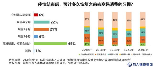綜合來(lái)看,疫情結(jié)束后預(yù)計(jì)1個(gè)月內(nèi)會(huì)前往商場(chǎng)的比例達(dá)到49.0%,其中立刻前往的占比為6.0%,觀望半個(gè)月的比例為21.0%。其中,25歲以下客群最為樂(lè)觀,希望立刻就去買買買的比例達(dá)11%。
