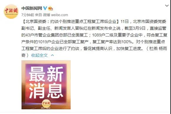 3月11日,北京市國資委黨委副書記、副主任、新聞發(fā)言人晉秋紅在新聞發(fā)布會上說,截至3月9日,直接監(jiān)管的43戶市管企業(yè)集團總部已全面復工;1089戶二級及重要子企業(yè)中,符合復工復產(chǎn)條件的1019戶企業(yè)已全部復工復產(chǎn),復工復產(chǎn)率達到100%。對個別推進重點工程復工滯后的企業(yè)進行了約談,督促其提高認識,加快復工進度。