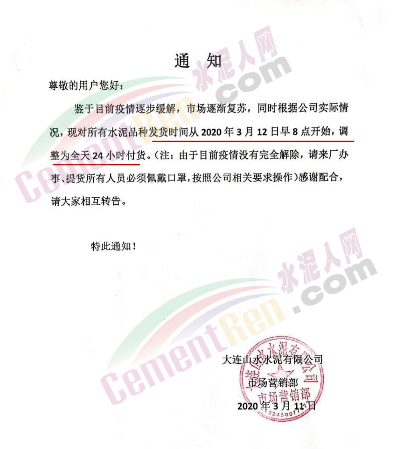 日前,大連山水水泥有限公司通知所有水泥品種發(fā)貨時(shí)間從3月12日早8點(diǎn)開(kāi)始,調(diào)整為全天24小時(shí)付貨。