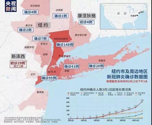 截至3月12日下午3點,紐約市新冠肺炎確診人數(shù)已經(jīng)逼近100人,而紐約州新冠肺炎確診人數(shù)已經(jīng)上升到了328人,僅次于華盛頓州。