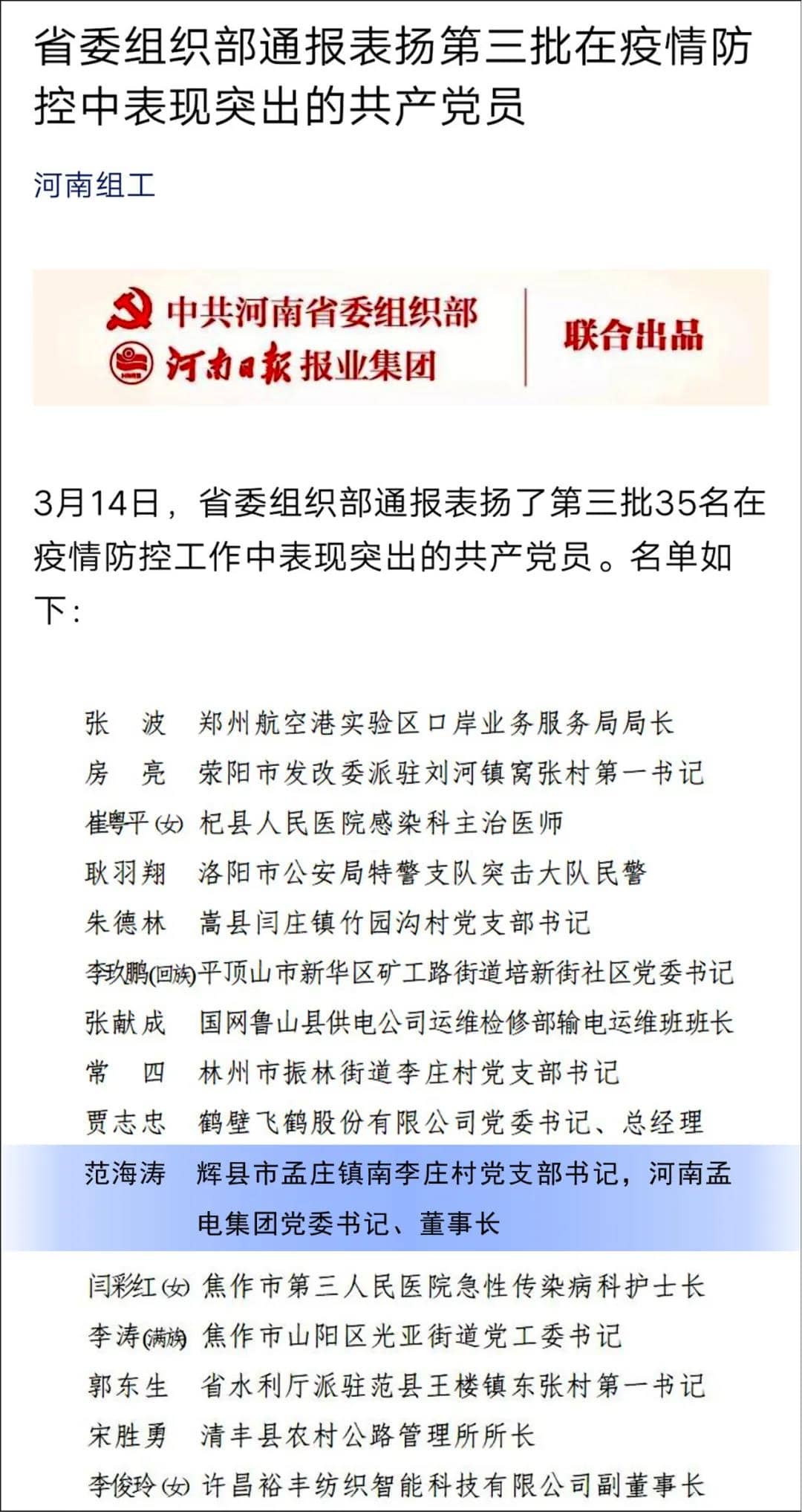 3月14日,河南省委組織部通報表揚了第三批在疫情防控工作中表現(xiàn)突出的共產(chǎn)黨員,輝縣市孟莊鎮(zhèn)南李莊村黨支部書記,河南孟電集團黨委書記、董事長范海濤名列其中。