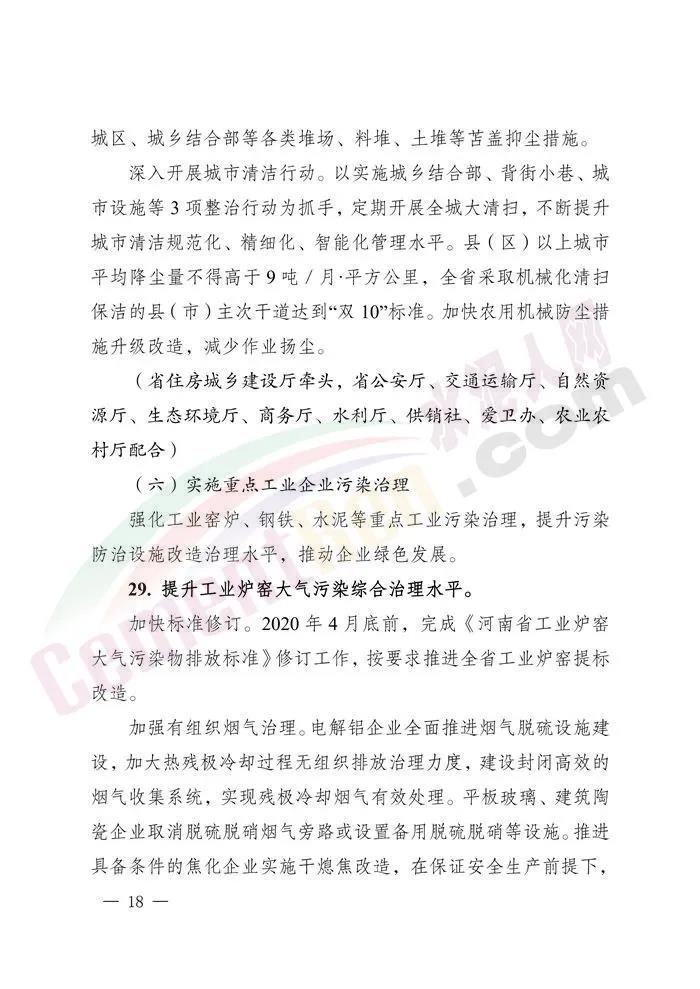 8.2020年4月底前,完成《河南省工業(yè)爐窯大氣污染物排放標(biāo)準(zhǔn)》修訂工作,推進(jìn)工業(yè)爐窯提標(biāo)改造。