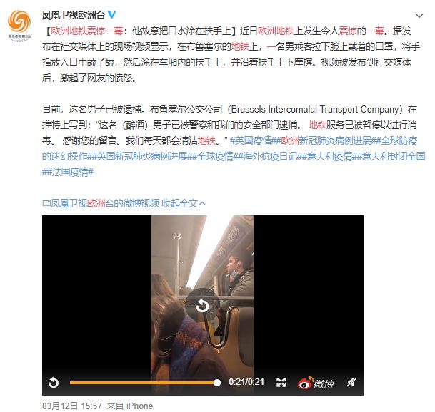 那么真實情況是這樣的嗎?小編認(rèn)真了解了一下,發(fā)現(xiàn)視頻中的事件真實存在,但事發(fā)地并不在中國,而是在歐洲。而且在3月12日,鳳凰衛(wèi)視歐洲臺的官方微博(@鳳凰衛(wèi)視歐洲臺)已對該事件進行過報道。這令人震驚的一幕發(fā)生在布魯塞爾的地鐵上。目前,這名男子已被捕。