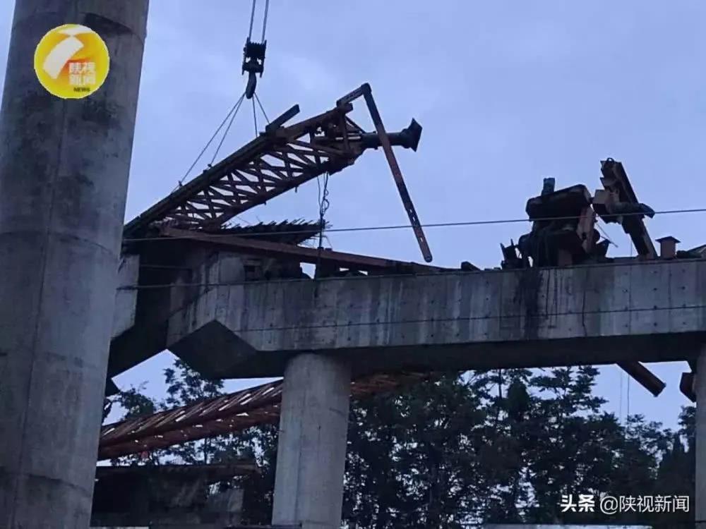 14時25分,架橋機吊掛1號梁橫移至2跨左幅1號位準備下降就位時,伴隨著“咔嚓”響聲,架橋機左前支腿鋼筒支撐銷軸突然脫落,左支撐鋼筒回縮下沉,1號箱梁以箱梁幾何重心為中心逆時針旋轉,架橋機向右側甩尾,帶動架橋機右主梁桁架連同右前支腿前沖約5m脫離2號橋墩蓋梁懸空墜落,左支撐鋼筒斷裂向右后方傾倒,架橋機瞬間傾覆解體。因主梁的旋轉使吊載的1號梁后部與已就位的3號梁刮擦纏繞,1號梁將3號梁拽出橋墩蓋梁一同墜落橋下在建的陽安鐵路二線軌道上。解體后向右滾轉傾翻的架橋機右主梁桁架前端將王俊霞、譚華軍、崔高賢、姚笛、付永平、董炳紅、季輝、王海濤、肖文9人砸中壓在橋面上,齊辰鵬、胡長安、李航博3人在閃避中不同程度軟組織擦傷。