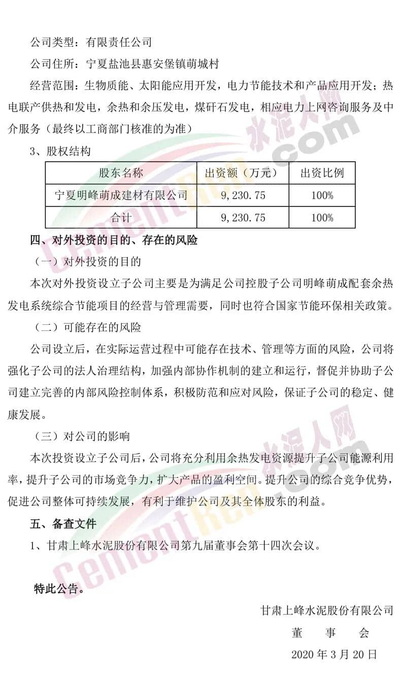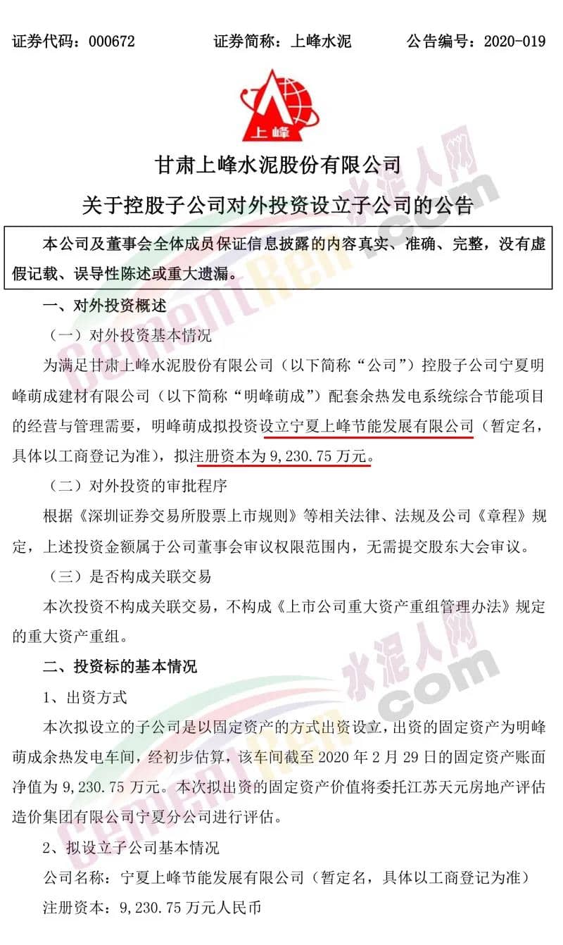 3月20日晚間,上峰水泥發(fā)布公告稱,為滿足公司控股子公司寧夏明峰萌成建材有限公司(以下簡稱“明峰萌成”)配套余熱發(fā)電系統(tǒng)綜合節(jié)能項(xiàng)目的經(jīng)營與管理需要,明峰萌成擬以固定資產(chǎn)的方式出資設(shè)立寧夏上峰節(jié)能發(fā)展有限公司,擬注冊資本為9230.75萬元,出資的固定資產(chǎn)為明峰萌成余熱發(fā)電車間。