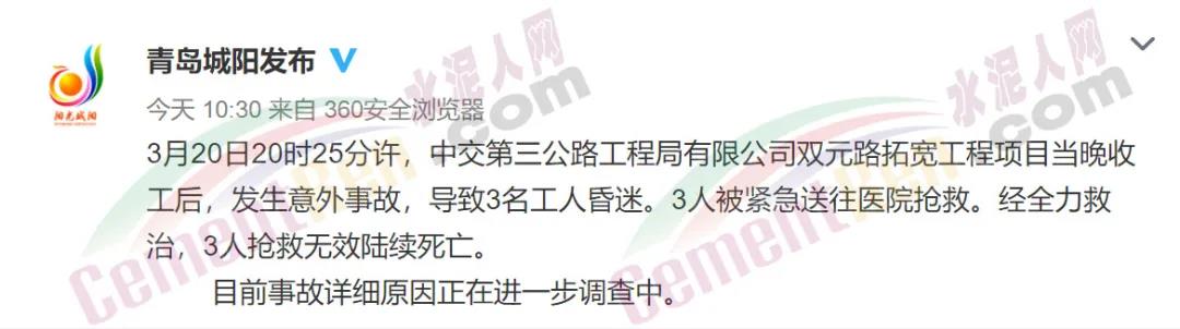 3月20日20時(shí)25分許,中交第三公路工程局有限公司雙元路拓寬工程項(xiàng)目當(dāng)晚收工后,發(fā)生意外事故,導(dǎo)致3名工人昏迷。3人被緊急送往醫(yī)院搶救。經(jīng)全力救治,3人搶救無效陸續(xù)死亡。