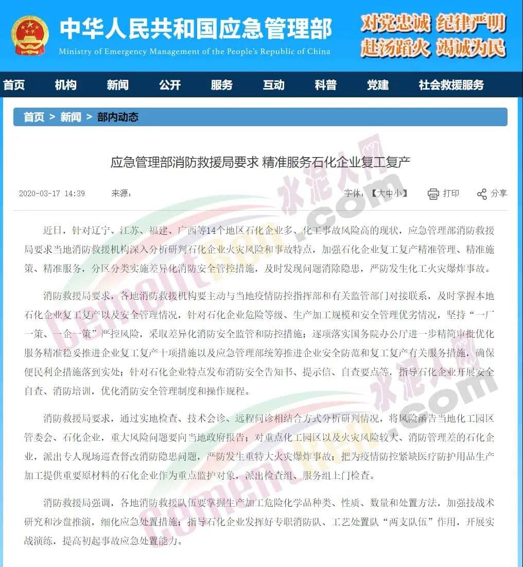 江蘇、北京、山西等地也積極響應(yīng)要求,推動(dòng)?;飞a(chǎn)企業(yè)復(fù)工復(fù)產(chǎn)工作,以及企業(yè)安全風(fēng)險(xiǎn)和事故隱患排查整治等各項(xiàng)工作,堅(jiān)決防范遏制各類事故發(fā)生。去年“3.21”響水爆炸事故的影響仍未散去,我們更應(yīng)當(dāng)引以為戒,吸取事故教訓(xùn),時(shí)刻保持警惕,牢記紅線,守住安全。