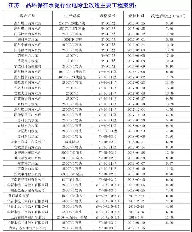 目前,江蘇一品環(huán)保的水泥窯電除塵超低排放改造技術(shù),積累了豐富的改造經(jīng)驗(yàn),已成功為中國(guó)建材南方水泥、湖南金山水泥、新疆莎車(chē)水泥、內(nèi)蒙古泰高、華新水泥集團(tuán)等100多條水泥生產(chǎn)線進(jìn)行了達(dá)標(biāo)和超低排放改造,眾多的業(yè)績(jī)案例,使江蘇一品積累了豐富的改造經(jīng)驗(yàn)和成熟的改造方案!