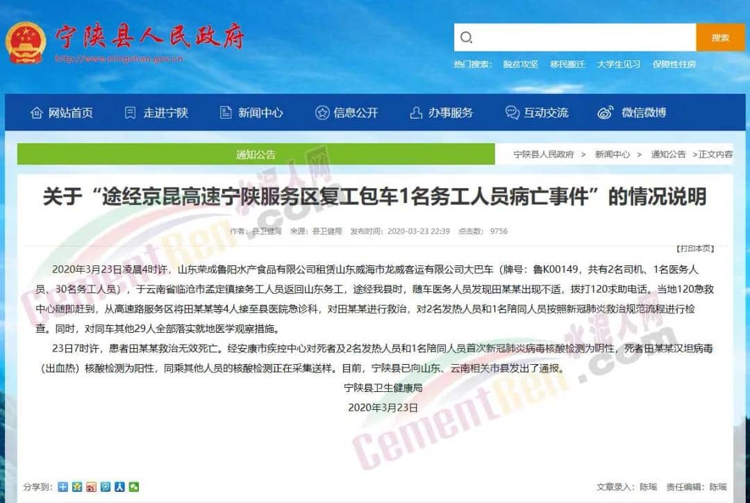 寧陜縣3月23日發(fā)布的《關(guān)于“途徑京昆高速寧陜服務(wù)區(qū)復(fù)工包車1名復(fù)工人員病亡事件”的情況說明》顯示,涉事大巴車系山東榮成魯陽水產(chǎn)食品有限公司向山東威海市龍威客運(yùn)有限公司租賃的,車上除兩名司機(jī)及一名醫(yī)務(wù)人員外,共乘坐30名務(wù)工人員,系從云南臨滄市接務(wù)工人員返回山東,途經(jīng)寧陜縣時(shí)因醫(yī)務(wù)人員發(fā)現(xiàn)田某身體不適,遂撥打120求助。