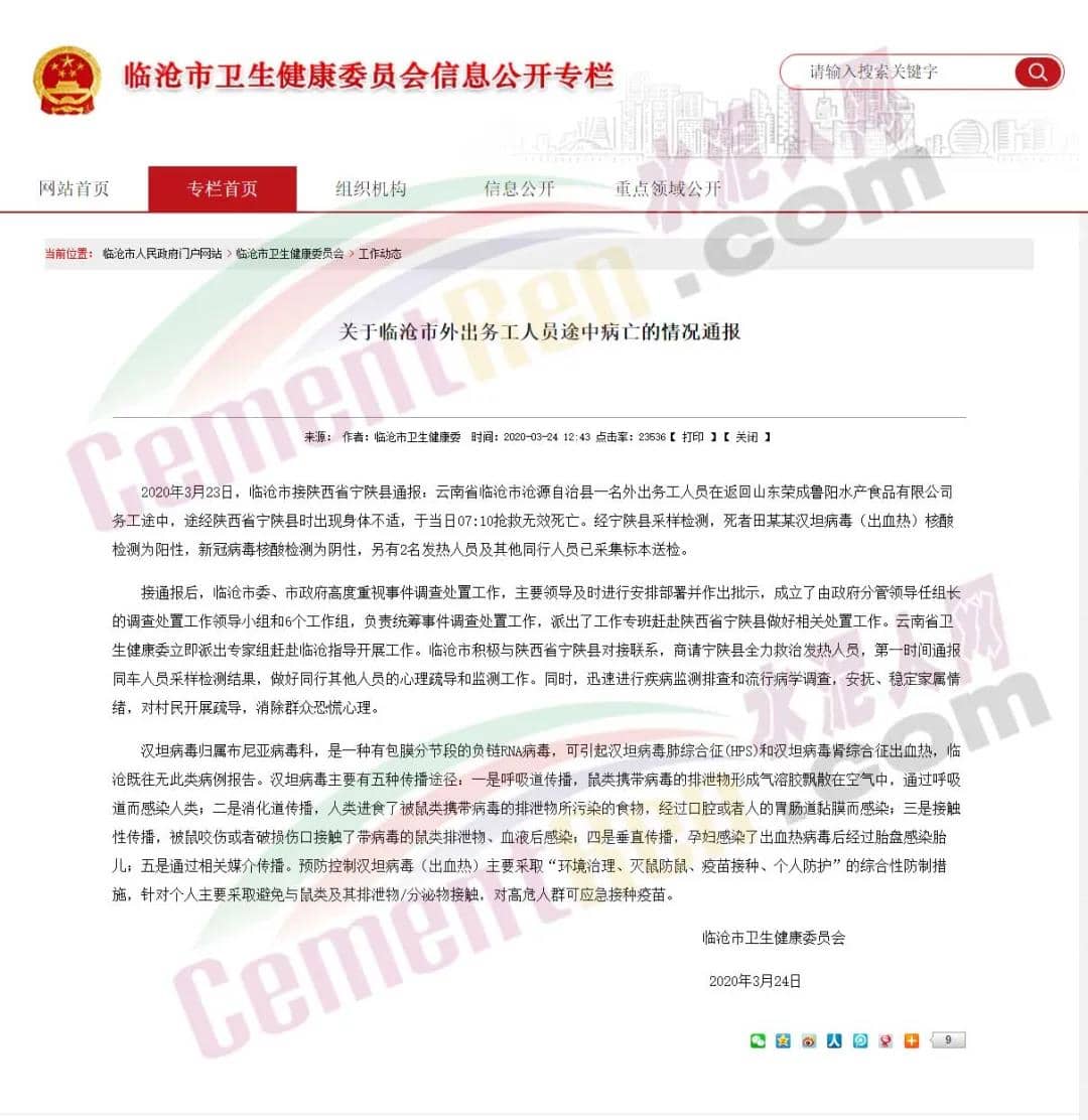 3月24日云南臨滄市健康委員會(huì)發(fā)布《關(guān)于臨滄市外出務(wù)工人員途中病亡情況的通報(bào)》稱,云南省臨滄市滄源自治縣一名外出務(wù)工人員在返回山東榮成魯陽水產(chǎn)食品有限公司務(wù)工途中,途經(jīng)陜西省寧陜縣時(shí)出現(xiàn)身體不適,于當(dāng)日07:10搶救無效死亡。經(jīng)寧陜縣采樣檢測(cè),死者田某某漢坦病毒(出血熱)核酸檢測(cè)為陽性,新冠病毒核酸檢測(cè)為陰性,另有2名發(fā)熱人員及其他同行人員已采集標(biāo)本送檢。
