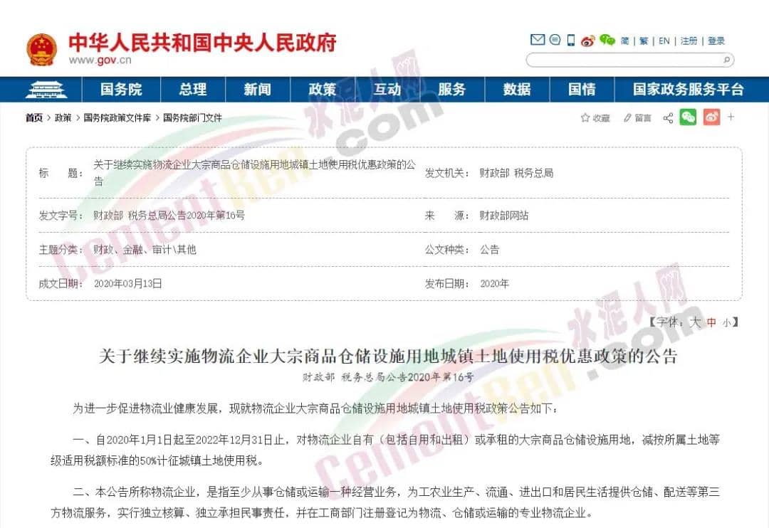 公告稱(chēng),自2020年1月1日起至2022年12月31日止,對(duì)物流企業(yè)自有(包括自用和出租)或承租的大宗商品倉(cāng)儲(chǔ)設(shè)施用地,減按所屬土地等級(jí)適用稅額標(biāo)準(zhǔn)的50%計(jì)征城鎮(zhèn)土地使用稅。