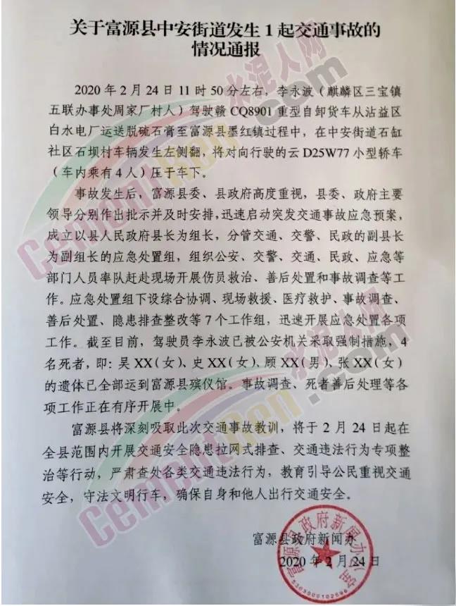 事故發(fā)生后,富源縣委、縣政府高度重視,縣委、政府主要領導分別作出批示并及時安排,迅速啟動突發(fā)交通事故應急預案成立以縣人民政府縣長為組長,分管交通、交警、民政的副縣長為副組長的應急處置組,組織公安、交警、交通、民政、應急等部門人員率隊趕赴現場開展傷員救治、善后處置和事故調查等工作。應急處置組下設綜合協調、現場救援、醫(yī)療救護、事故調查、善后處置、隱患排査整改等7個工作組,迅速開展應急處置各項工作。截至目前,駕駛員李永波已被公安機關采取強制措施,4名死者,即:吳XX(女)、史XX(女)、顧XX(男)、張XX(女)的遺體全部運到富源縣殯儀館。