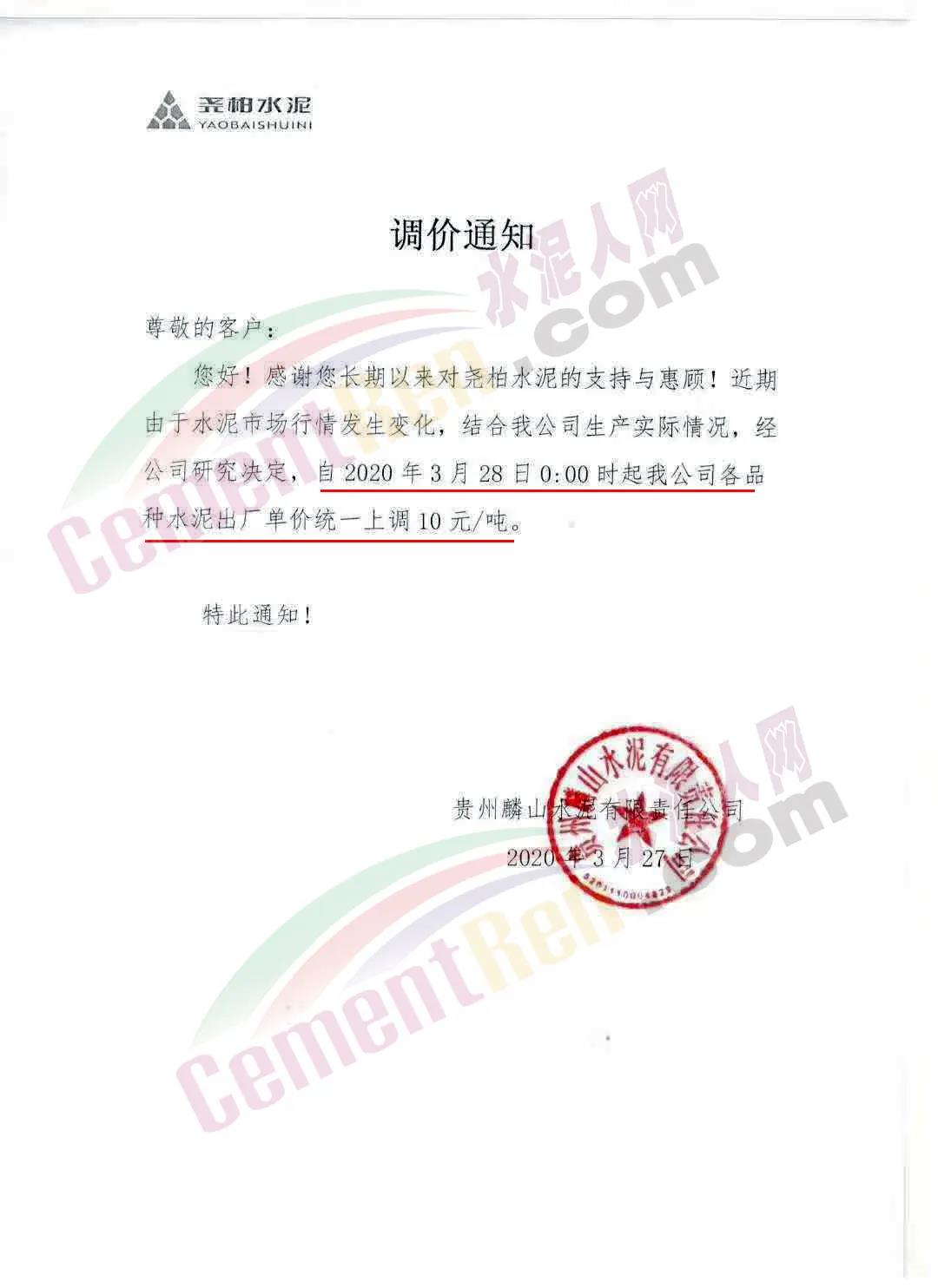 春江水泥通知水泥價(jià)格下調(diào)20元/噸。