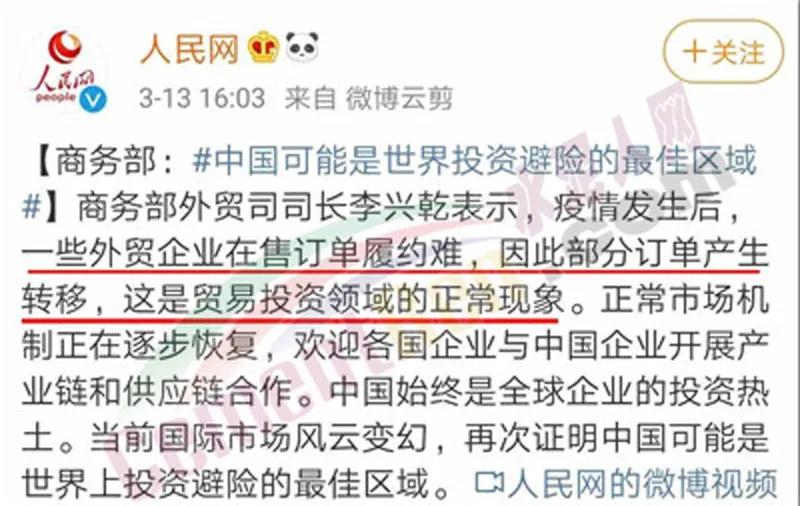 其實,早在中國疫情最嚴(yán)重的時候,由于外貿(mào)企業(yè)停工,無法按期交付訂單,已經(jīng)導(dǎo)致部分訂單轉(zhuǎn)移到了其它國家。國家商務(wù)部門也注意到這個問題,并表示這是正常的現(xiàn)象。
