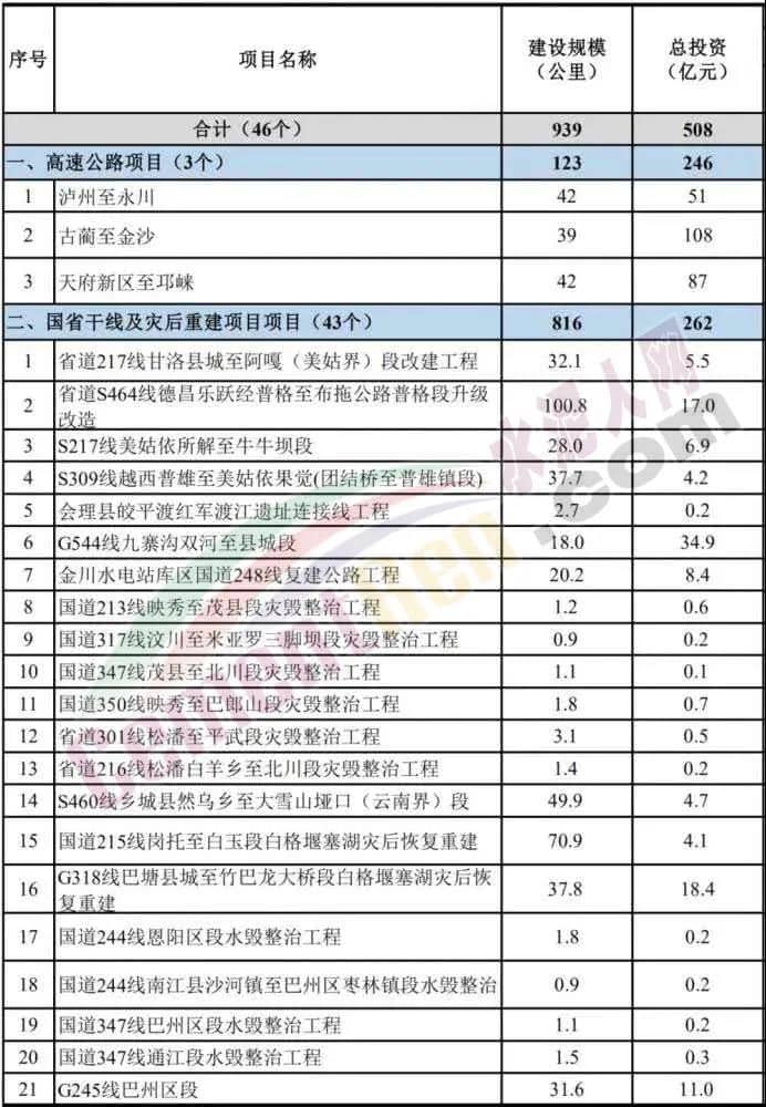 這是新冠肺炎疫情后,四川省首次舉行省級層面重大項目集中開工。涉及公路交通項目共46個,總長939公里,總投資508億元。其中,高速公路項目3個、123公里、246億元,國省干線公路項目43個、816公里、262億元。
