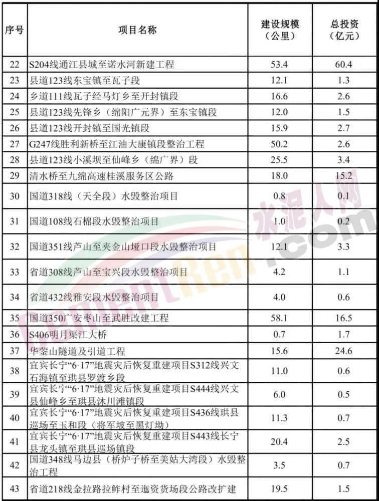 2、促進(jìn)五區(qū)協(xié)同發(fā)展,強(qiáng)化路網(wǎng)互聯(lián)互通,如天府新區(qū)至邛崍、古藺至金沙等2個高速公路(81公里、195億元)、S204線通江縣城至諾水河等21個國省干線(241公里、92億元);