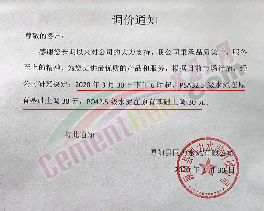 昨日(3月30日)原陽(yáng)縣同力水泥有限公司發(fā)布調(diào)價(jià)通知稱:根據(jù)目前市場(chǎng)行情,經(jīng)公司研究決定:2020年3月30日下午6時(shí)起,PSA32.5級(jí)水泥在原有基礎(chǔ)上調(diào)30元,PO42.5級(jí)水泥在原有基礎(chǔ)上調(diào)30元。