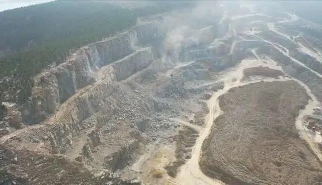 在航拍視頻升起后,隨著航拍不斷地向企業(yè)里側(cè)飛行,映入眼簾的景象令人震驚,整個(gè)采石場(chǎng)面積巨大,數(shù)十輛大型挖掘破碎機(jī)械正在工作,原石運(yùn)輸自卸車也依次排開,等待裝載,而開采過程中產(chǎn)生的煙霧粉塵如同霧霾一樣四處飄揚(yáng),最里側(cè)風(fēng)炮機(jī)正在進(jìn)行爆破前的打眼填藥工作,鉆機(jī)工作期間也是粉塵煙霧彌漫,整個(gè)現(xiàn)場(chǎng)正如村民所說污染肆意,在現(xiàn)場(chǎng)沒有見到任何的防塵降塵霧炮噴淋等環(huán)保措施,更不說做好國土部門要求的邊開采邊覆綠等措施,典型的屬于粗放式開采施工,完全藐視《環(huán)保法》和《礦產(chǎn)資源法》的存在,開山采石我行我素,生產(chǎn)污染肆無忌憚無所畏懼。