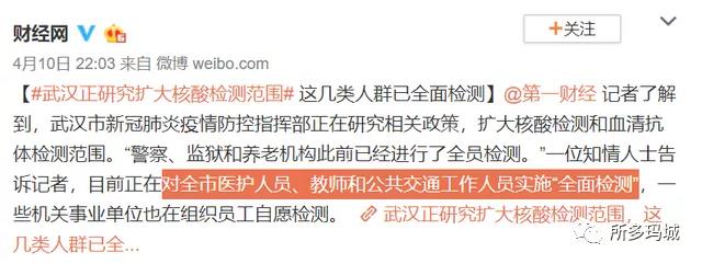 據@財經網 報道,武漢市新冠肺炎疫情防控指揮部正在研究相關政策,擴大核酸檢測和血清抗體檢測范圍。“警察、監(jiān)獄和養(yǎng)老機構此前已經進行了全員檢測。”一位知情人士告訴記者,目前正在對全市醫(yī)護人員、教師和公共交通工作人員實施“全面檢測”,一些機關事業(yè)單位也在組織員工自愿檢測。