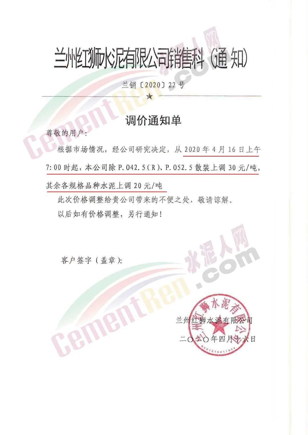 蘭州紅獅水泥有限公司銷售科通知 ,根據(jù)市場(chǎng)情況經(jīng)公司研究決定 ,從4月16日上午7時(shí)起,除P.O42.5(R)、P.O52.5散裝水泥上調(diào)30元/噸,其余各規(guī)格品牌上調(diào)20元/噸。