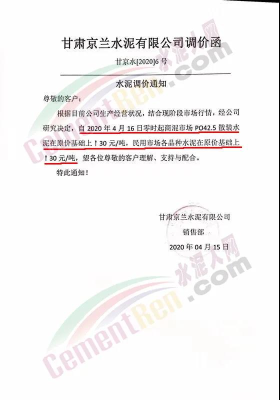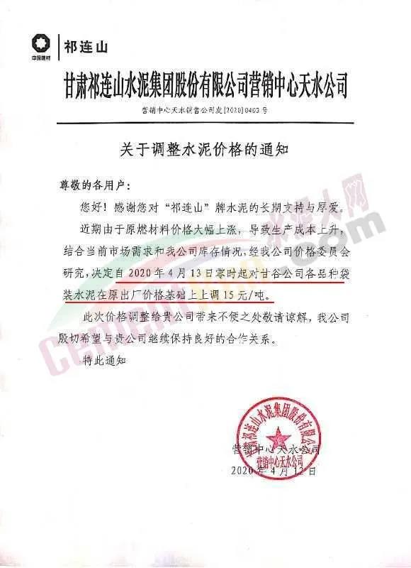 甘肅三易水泥有限責(zé)任公司調(diào)價(jià)通知稱,受疫情影響,致使公司生產(chǎn)原材料及運(yùn)輸成本大幅度增漲,經(jīng)公司研究決定自4月16日零時(shí)起,對(duì)公司所生產(chǎn)的各品種水泥在現(xiàn)有價(jià)格基礎(chǔ)上上調(diào)30元/噸。