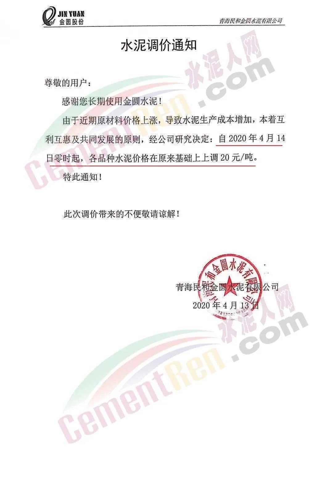 青海民和金圓水泥有限公司通知由于近期原材料價(jià)格上漲,導(dǎo)致水泥生產(chǎn)成本增加,經(jīng)公司研究決定自4月14日零時(shí)起,各品種水泥在原基礎(chǔ)上上調(diào)20元/噸。