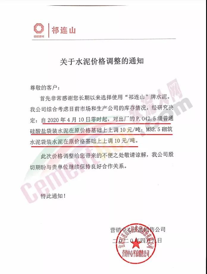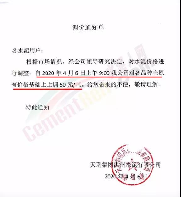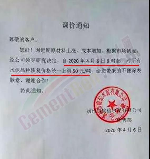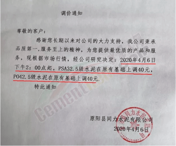 4月7日河南同力水泥通知:因省各水泥線錯(cuò)峰停產(chǎn)、環(huán)保提升成本增加,經(jīng)公司研究決定:從2020年4月7日8:30點(diǎn)起,各品種袋、散水泥均上漲20元/噸。