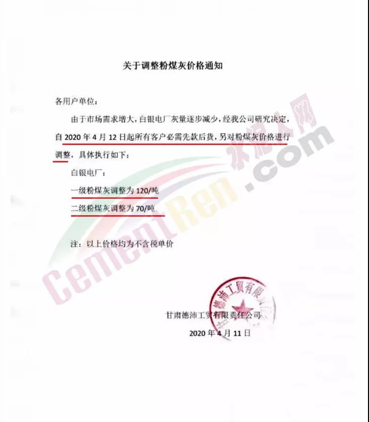 同期,白銀電廠粉煤灰價(jià)格也通知上調(diào)。4月11日甘肅德沛工貿(mào)有限責(zé)任公司通知由于市場(chǎng)需求增大,白銀電廠灰量逐步減少,經(jīng)公司研究決定自4月12日起所有客戶必須先款后貨,同時(shí)對(duì)粉煤灰價(jià)格進(jìn)行調(diào)整。一級(jí)粉煤灰調(diào)整為120元/噸,二級(jí)粉煤灰調(diào)整為70元/噸。