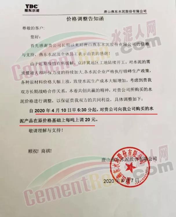 4月7日,河北唐山燕東水泥股份有限公司發(fā)調(diào)價(jià)函稱,近期疫情有所緩解,京津冀地區(qū)工地陸續(xù)開工,對(duì)水泥的需求量增大和環(huán)保力度的持續(xù)加大,各水泥企業(yè)嚴(yán)格執(zhí)行錯(cuò)峰生產(chǎn)政策,各種原材料價(jià)格大幅上漲,致使水泥生產(chǎn)成本大幅增加。自4月10日早6:30分起,水泥價(jià)格在原基礎(chǔ)上上調(diào)20元/噸。