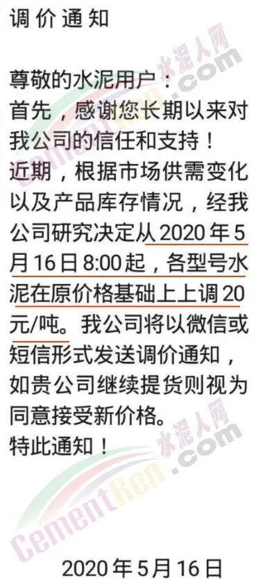 水泥人網(wǎng)通訊員消息,日前,陜西區(qū)域蒲城堯柏水泥通知自5月16日8時起上調(diào)水泥價格20元/噸。且表示 若繼續(xù)提貨,則視為默認新價格執(zhí)行。