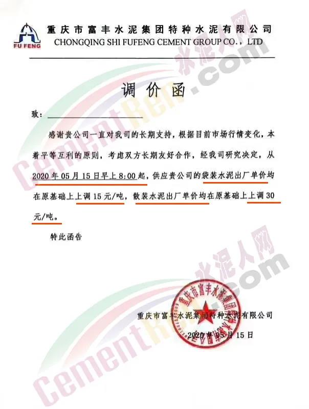 重慶市富豐水泥集團特種水泥有限公司通知,根據(jù)目前市場行情變化 ,經(jīng)公司研究決定從5月15日早8時起,袋裝水泥出廠價上調(diào)15元/噸,散裝水泥出廠價上調(diào)30元/噸。