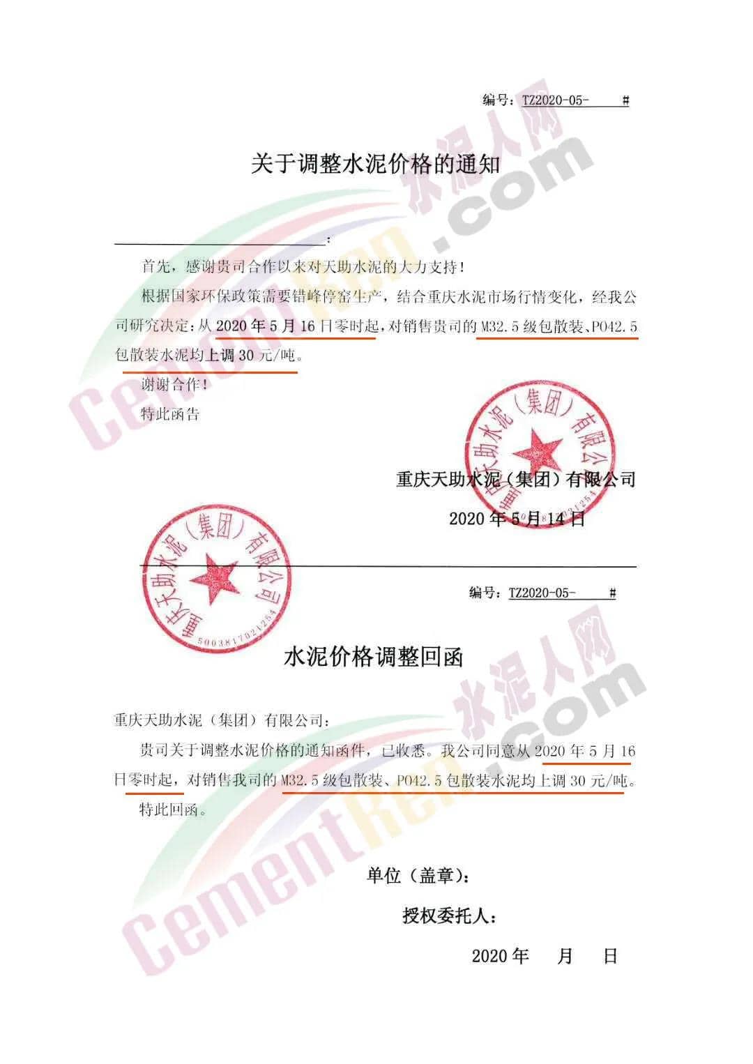 重慶天助水泥(集團)有限公司通知根據(jù)國家環(huán)保政策需要錯峰停窯,結合 重慶水泥市場行情變化,經(jīng)公司研究決定從5月16日零時起,對M32.5級PO42.5級包裝和散裝水泥價格上調(diào)30元/噸。