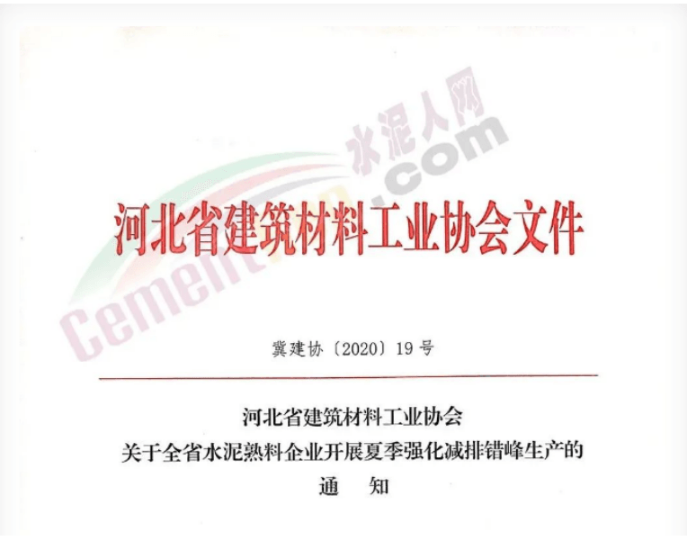 日前,河北省建筑材料工業(yè)協(xié)會發(fā)布《關(guān)于全省水泥熟料企業(yè)開展夏季強化減排錯峰生產(chǎn)的通知》,河北省水泥企業(yè)結(jié)合疫情防控和復(fù)工復(fù)產(chǎn)情況,冀中南區(qū)域錯峰停窯10天,冀北區(qū)域錯峰停窯10天。