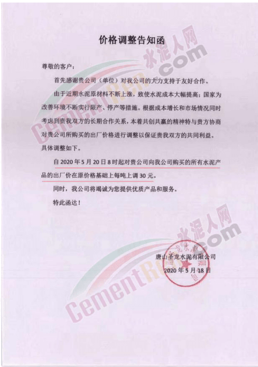 5月18日,唐山圣龍水泥有限公司通知,根據(jù)市場變化情況,國家為改善環(huán)境不斷實行限產(chǎn)、停產(chǎn)等措施,自2020年5月20日8時起所有水泥產(chǎn)品的出廠價格在原價格基礎(chǔ)上每噸上調(diào)30元。